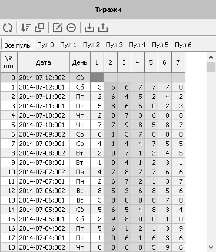 Также, для таких лотерей появляется дополнительная командная панель «Пулы», где можно выбрать какие пулы будут анализироваться при сборе статистики. Нумерация идет от 0, где 0 — основной пул. Кнопка «Все пулы» указывает на анализ всех номеров.