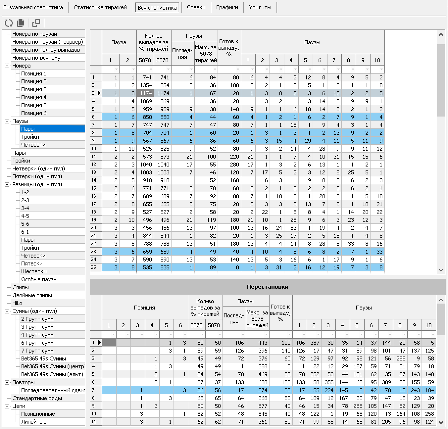 Статистика зависит от включенного анализа по пулам и зависит от включенной сортировки номеров тиражей.