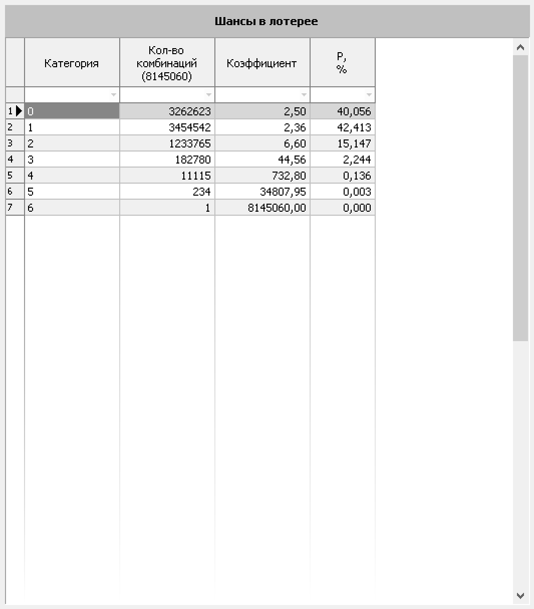 Данный инструмент предназначен для оценки шансов угадать определенную категорию (число угаданных номеров) в текущей выбранной лотерее.