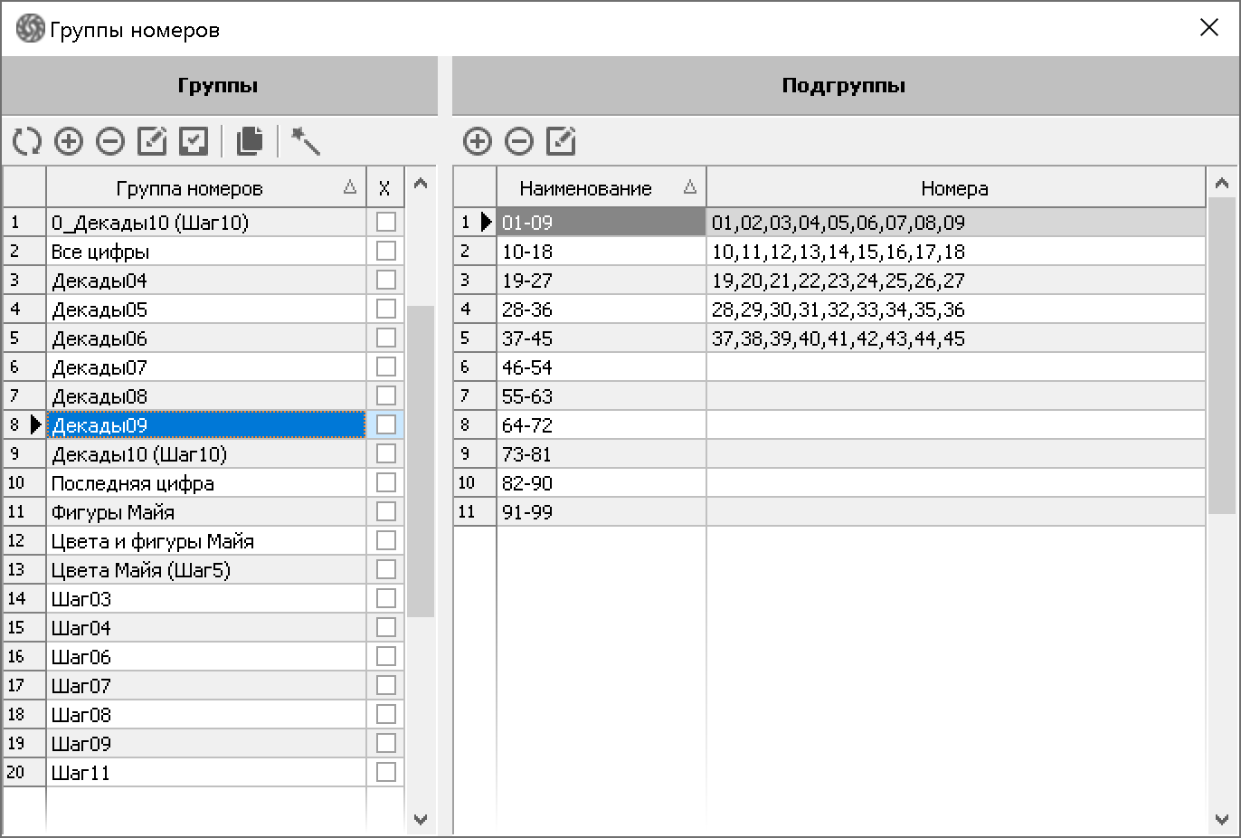 Программа автоматически отображает номера в подгруппах, ограниченные по минимальному и максимальному номерам текущей лотереи. Таким образом, чтобы группа была универсальной для различных лотерей, рекомендуется составить ее для диапазона номеров [0..99].