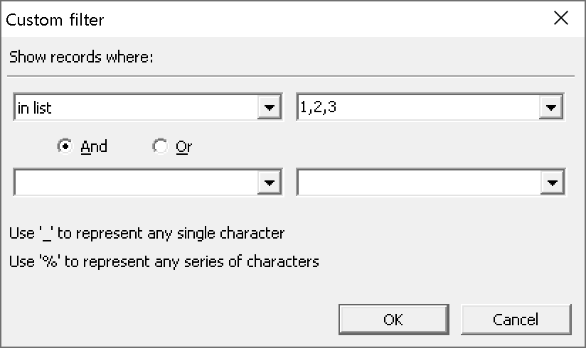 Текст выражения в ячейке фильтра должен иметь следующий формат: Условие1 [AND|OR Условие2]. Допускается не более двух условий.